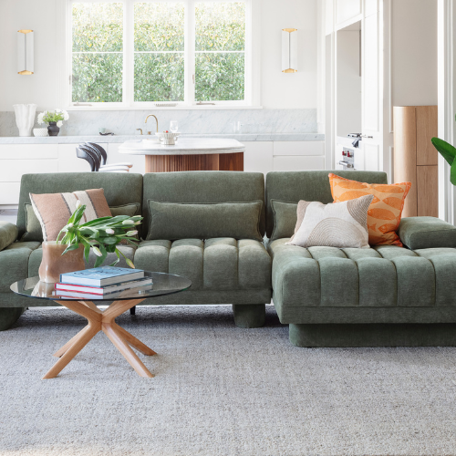 Mix and match sofas, armchairs, side tables and cabinets in different materials like timber, metal and woven finishes.