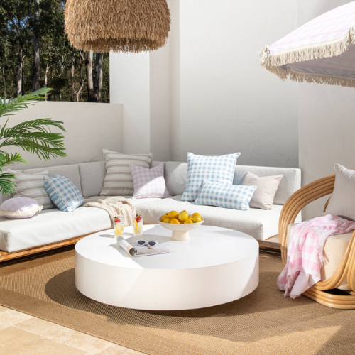 Products: Tannum Natural Border Outdoor Rug, Pillow Talk