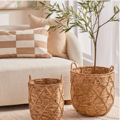 Textured elements like woven baskets, jute rugs and linen upholstery.