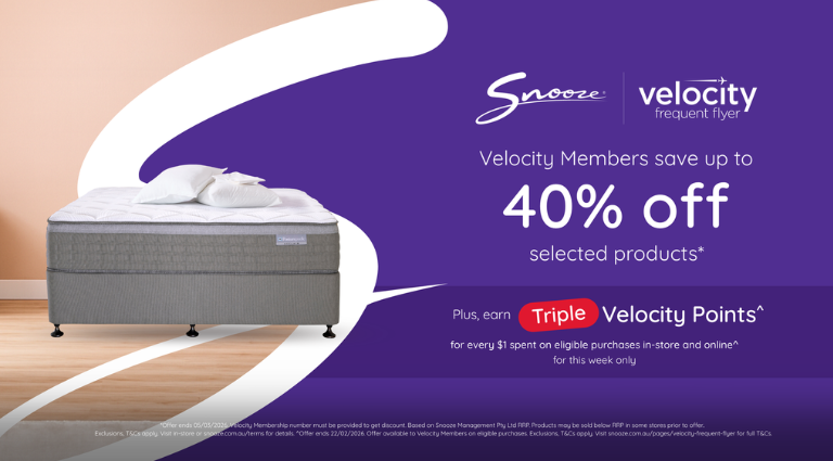 ^Offer ends 22/02/2026. Offer available to Velocity Members on eligible purchases. Exclusions, T&Cs apply. Visit snooze.com.au/pages/velocity-frequent-flyer for full T&Cs.